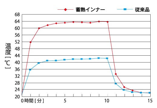 従来品との蓄熱保温測定比較。約1.5倍の蓄熱保温効果を発揮します。